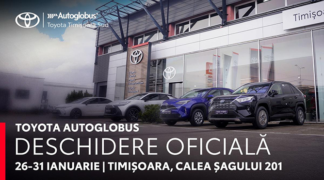 Lansarea oficială a noului dealer Toyota Timișoara Sud va fi marcată printr-o săptămână festivă, denumită Open Week Toyota Autoglobus, care va avea loc între 26 și 31 ianuarie 2026, în intervalul orar 09:00 – 19:00. Evenimentul va avea loc la adresa Calea Șagului 201, Timișoara.
